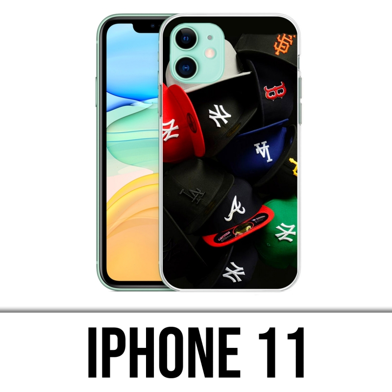 Funda para iPhone 11 que representa gorras de diferentes colores de la marca New Era